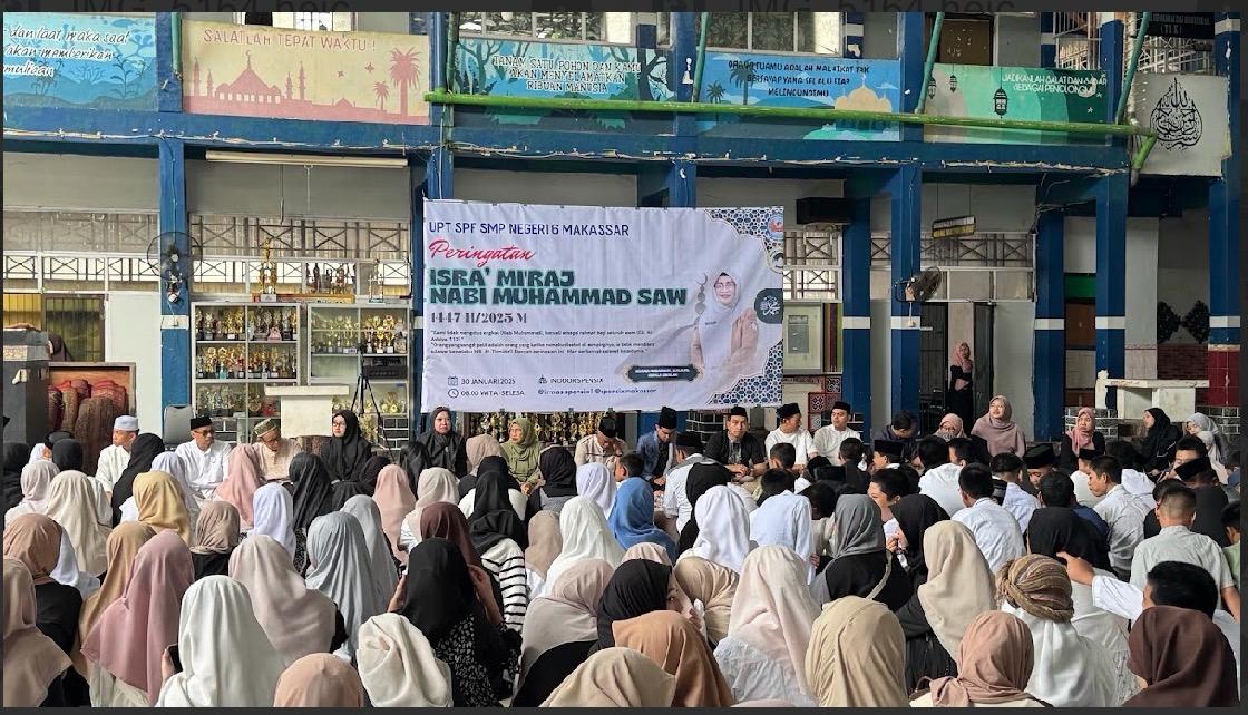 Jejakpendidikan Makassar, Seperti tahun-tahun sebelumnya, UPT SPF SMPN 6 Makassar Sulsel, kembali menggelar peringatan Isra’ Mi’raj, berlangsung di pelataran sekolah, Jumat 30 Januari 2026