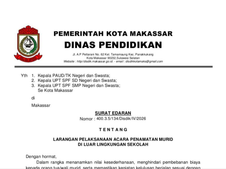 JejakPendidikan–Dinas Pendidikan (Disdik) Kota Makassar mengeluarkan Surat Edaran Nomor 400.3.5/134/Disdik/IV/2026 yang melarang penyelenggaraan acara penamatan atau kelulusan murid di luar lingkungan sekolah maupun tempat komersial.